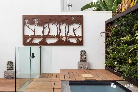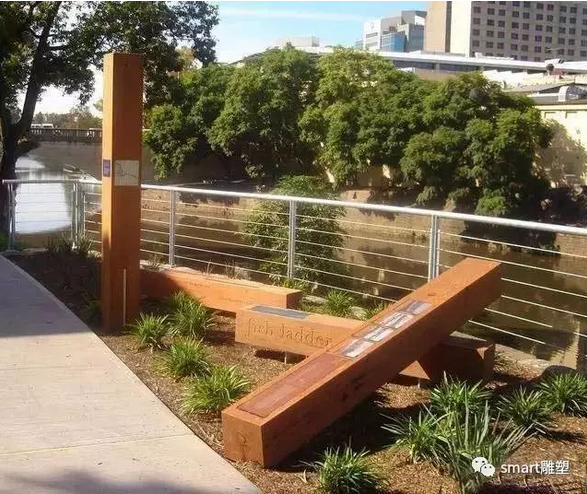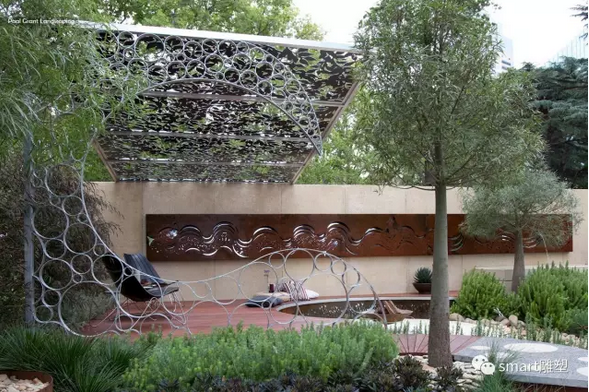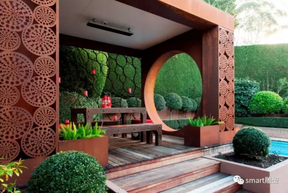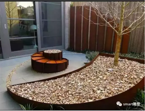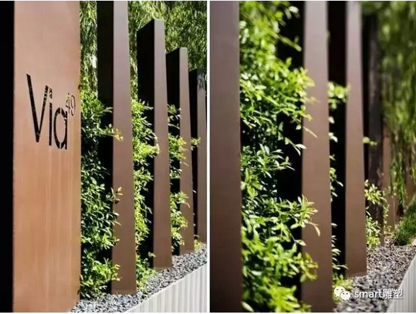 它具有突出的視覺表現力,會隨著時間而變化,其色彩明度和飽和度比一般的構筑物材料要高,因此在園林綠植背景下容易突顯出來。耐候鋼雕塑會隨著時間而發生變化,其色彩受環境、氣候影響變化較大,放置很久之后容易從鮮亮的紅褐色變成暗淡的深灰色,隨著時光老化,使其充滿美感的色彩和質感體現出別出心裁的藝術魅力,還可以追溯場地的歷史感、記錄時間的瞬間感、延伸場地的生命力,體現可持續的景觀。