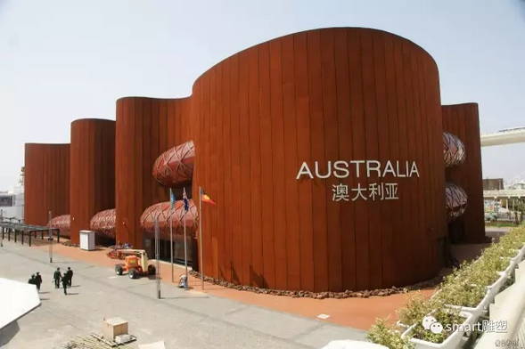 耐候鋼雕塑表面是一層銹紅色物質,摸上去十分粗糙,質感十分特殊。由于耐候鋼表面可形成的這一特致密氧化層具有穩定、均勻的自然銹紅色,這使它成為一種有吸引力的材料。2010年世博會的澳大利亞館也大量采用了耐候鋼材料營造紅土之州的氛圍。